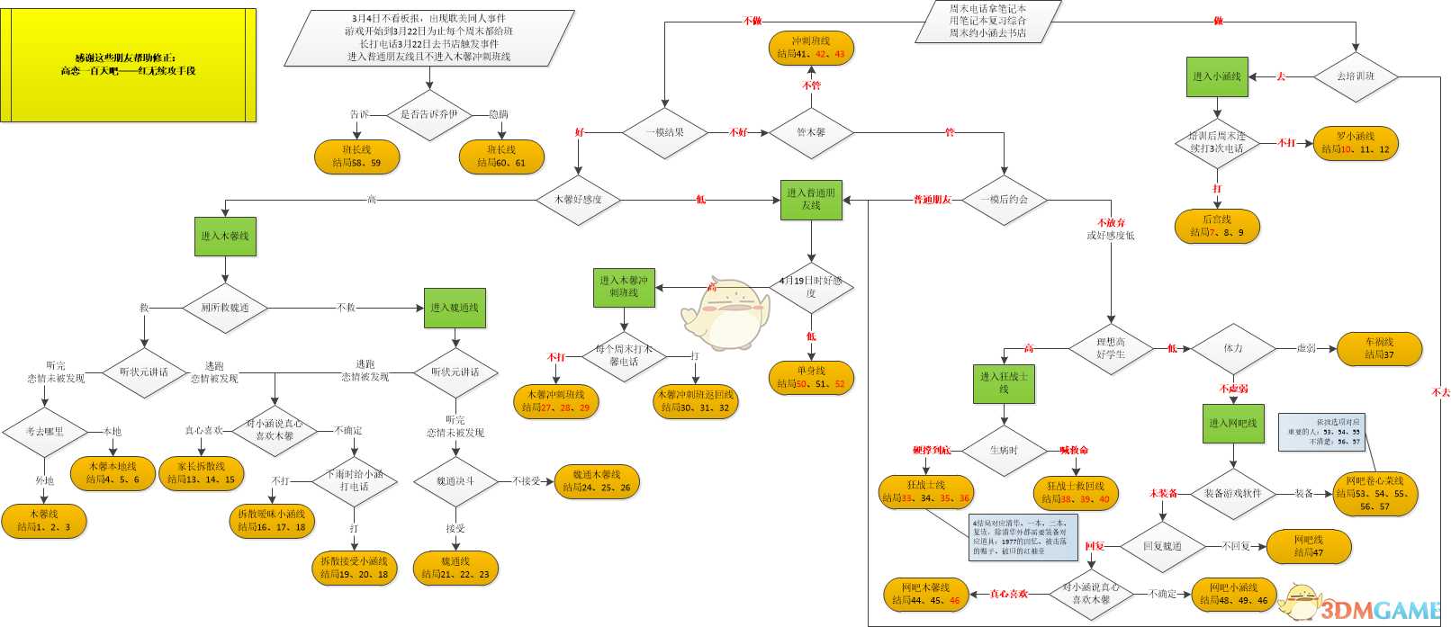 《高考恋爱一百天》全结局流程示意图 《高考恋爱一百天》作为一款文字类的模拟恋爱游戏有着超过五十种结局,玩过相似作品的玩家可能会比较清楚结局取决于关键点的选择和妹子们的好感度,由于结局比较多所以一个个的解锁过去很容易造成混乱,本 游戏攻略 2023-03-30 0 次查看